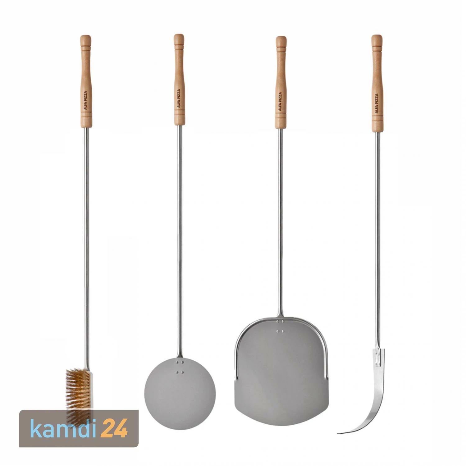 Bestens ausgerüstet zum Pizza backen sind Sie mit dem von . Das hochwertige und edle Set besteht aus einer Pizzaschaufel, einem Pizzaheber, einem Glutschieber und einer Reinigungsbürste. Die Produkte zeichnen sich besonders durch Robustheit, leichte Handhabung und einfache Reinigungsmöglichkeit aus. Sie sind aus Edelstahl gefertigt und sehen dadurch nicht nur elegant aus, sondern sind auch stabil und lassen sich einfach reinigen. Die Holzgriffe liegen angenehm in der Hand und sorgen bei der Nutzung für einen hohen Komfort.