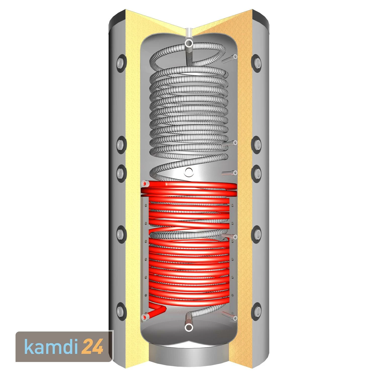 Der hochwertige ist zur Heizwasserspeicherung und Trinkwassererwärmung mittels Solaranlagen, Holzheizsystemen, Blockheizkraftwerken und konventionellen Wärmeerzeugern geeignet. Die Verknüpfung mit wasserführenden Kaminöfen und Kamineinsätzen, Heizkesseln, Holzvergasern, PVA etc. ist kein Problem. Der Solarwärmetauscher aus Stahlrohr ist fest eingeschweißt, der hingegen ist austauschbar. Dank der hohen, schlanken Konstruktion des Hygienespeichers wird eine effiziente Schichtenspeicherung ermöglicht. Das Durchlaufprinzip des Speichers sichert Ihnen die legionellenfreie Erwärmung von Brauchwasser bei einer hohen Wasserfördermenge.
