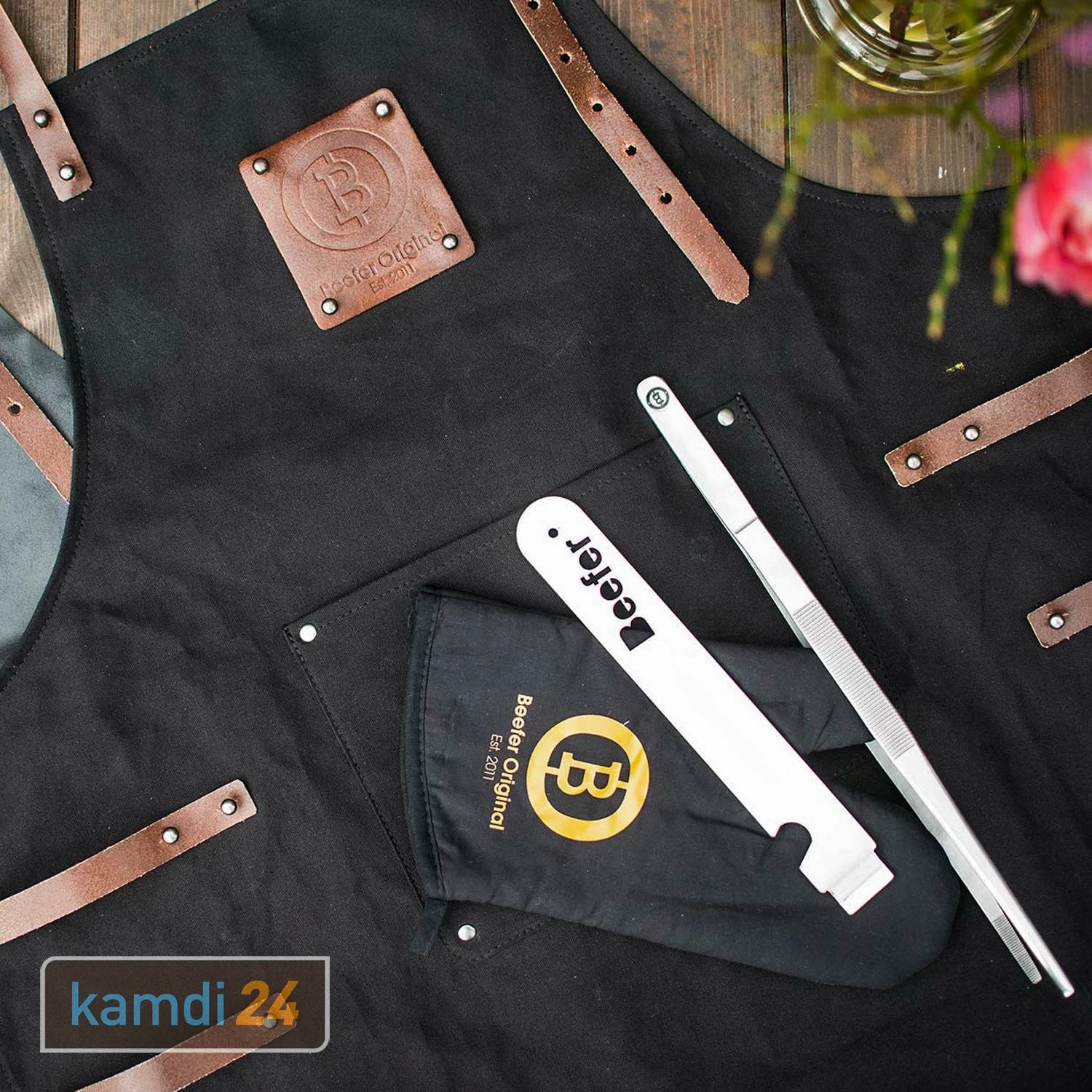 Die von schützt Ihre Kleidung zuverlässig vor Hitze und Fettspritzern während des Beefens. Das verstellbare Nackenband ermöglicht eine individuelle Anpassung der Schürze an den Grillmeister oder die Grillmeisterin. In der großen Bauchtasche und den seitlichen Einhängelaschen können Sie oder ein Handtuch griffbereit aufbewahren.