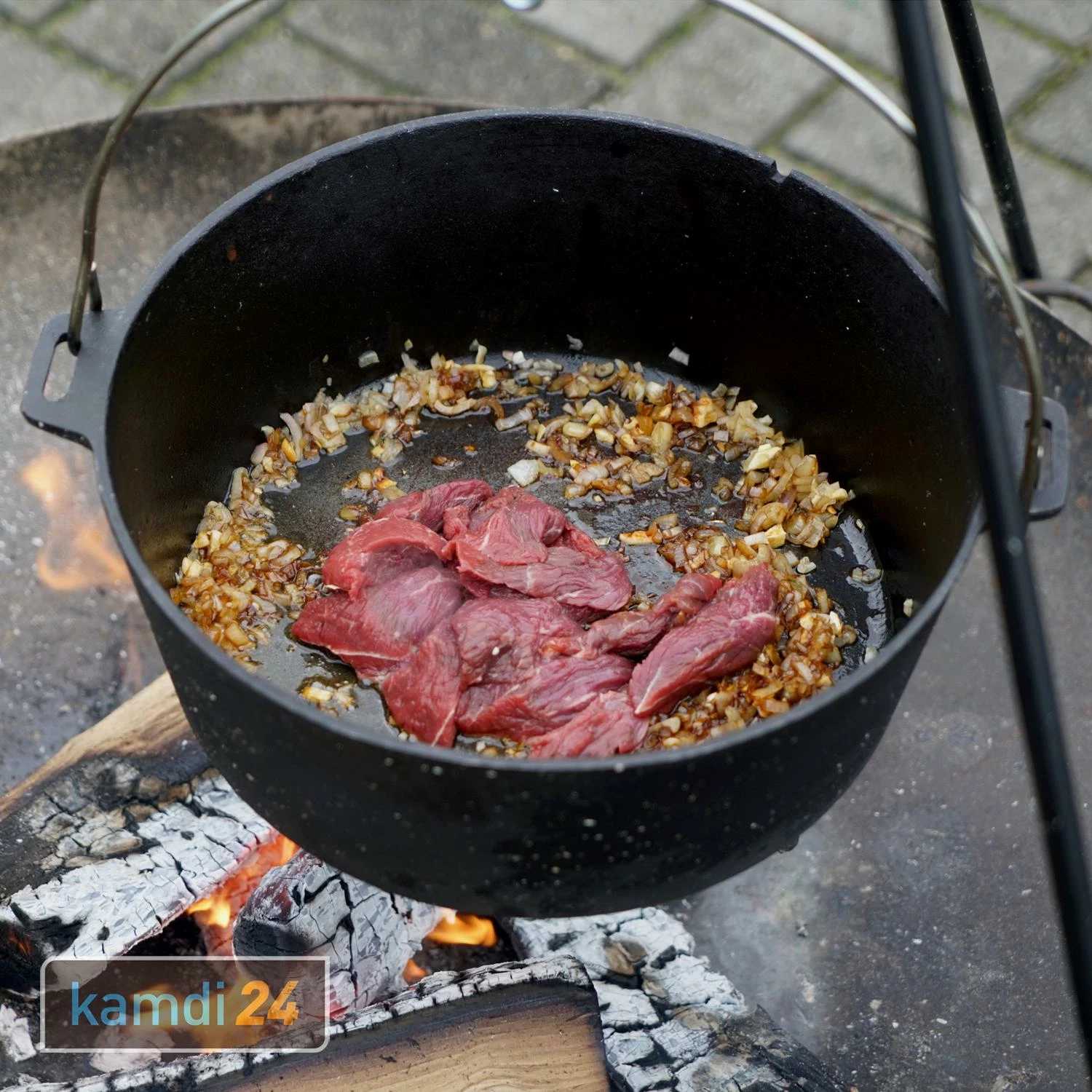 Stellen Sie Ihren auf seinen drei Beinen unmittelbar in die Glut oder hängen Sie ihn an seinem stabilen Metallhenkel klassisch über dem Lagerfeuer auf – Sie haben die Wahl.