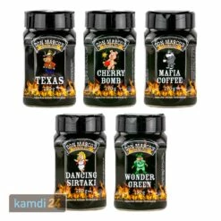 enthält hochwertigen Muscovado-Zucker, der Ihrem Barbecue einen typisch texanischen Geschmack verleiht und das Grillgut mit einer leckeren goldenen Schicht überzieht. Der Rub ist mit seinem fruchtig-scharfen Aroma, das durch Zimt und Sauerkischen geprägt wird, die perfekte Würzmischung für das indirekte Grillen von Ribs, Steaks und Geflügelbrust. verbindet mediterrane Kräuter, eine angenehme Schärfe und eine feine Espresso-Note zu einem einmaligen Geschmackserlebnis: das Beste, was rotem Fleisch wie Lamm, Rind oder Wild passieren kann. besticht mit intensiven Kräutern und feinen Gewürzen, die perfekt mit Lamm- und Schweinefleisch harmonieren. ist ein Universalgewürz für jede Fleischsorte und für Gemüse, Käse, Soßen und Dips. Ein frischer Kräutergeschmack, abgerundet mit feinen Gewürzen, der in keiner Küche fehlen darf.