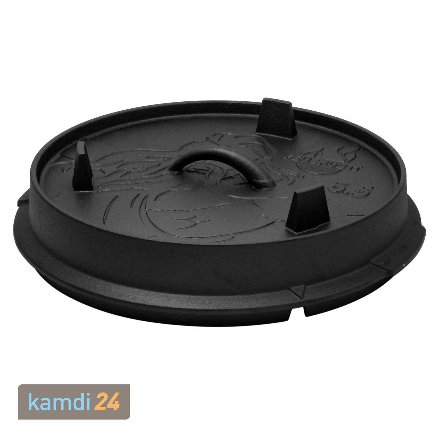 Dank des am Gusstopf können Sie ihn mühelos an einem Dreibein über offenes Feuer aufhängen. Durch die Möglichkeit, mit Oberhitze zu grillen und Briketts auf dem Deckel zu platzieren, bietet der Dutch Oven zusätzliche Grillmöglichkeiten. Die drei Beine des Deckels ermöglichen auch dessen Verwendung als Servierplatte oder sogar als eigenständige Pfanne. Der FEUERGOTT Dutch Oven verfügt über einen ohne Füße, wodurch er auch auf einem heimischen Herd verwendet werden kann.