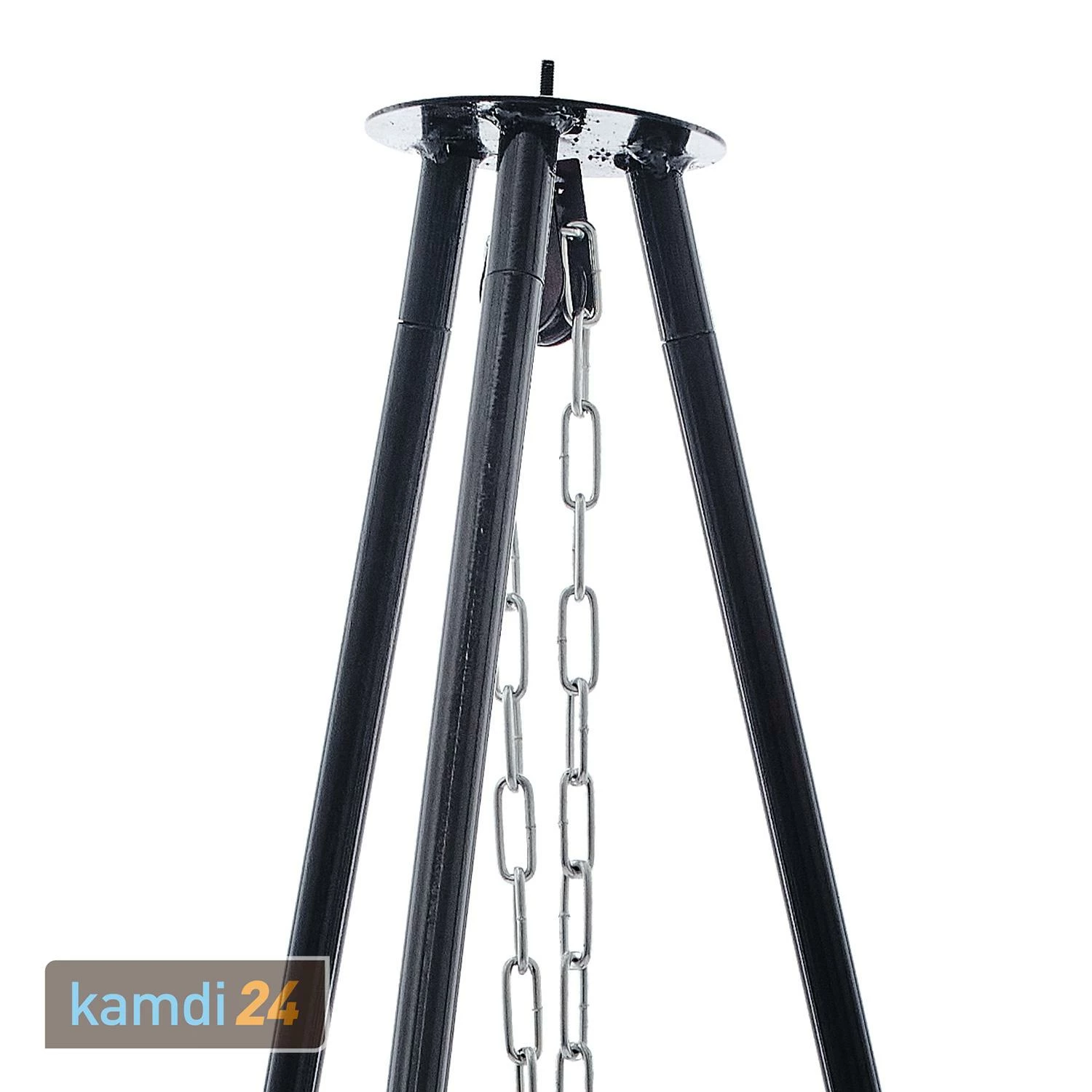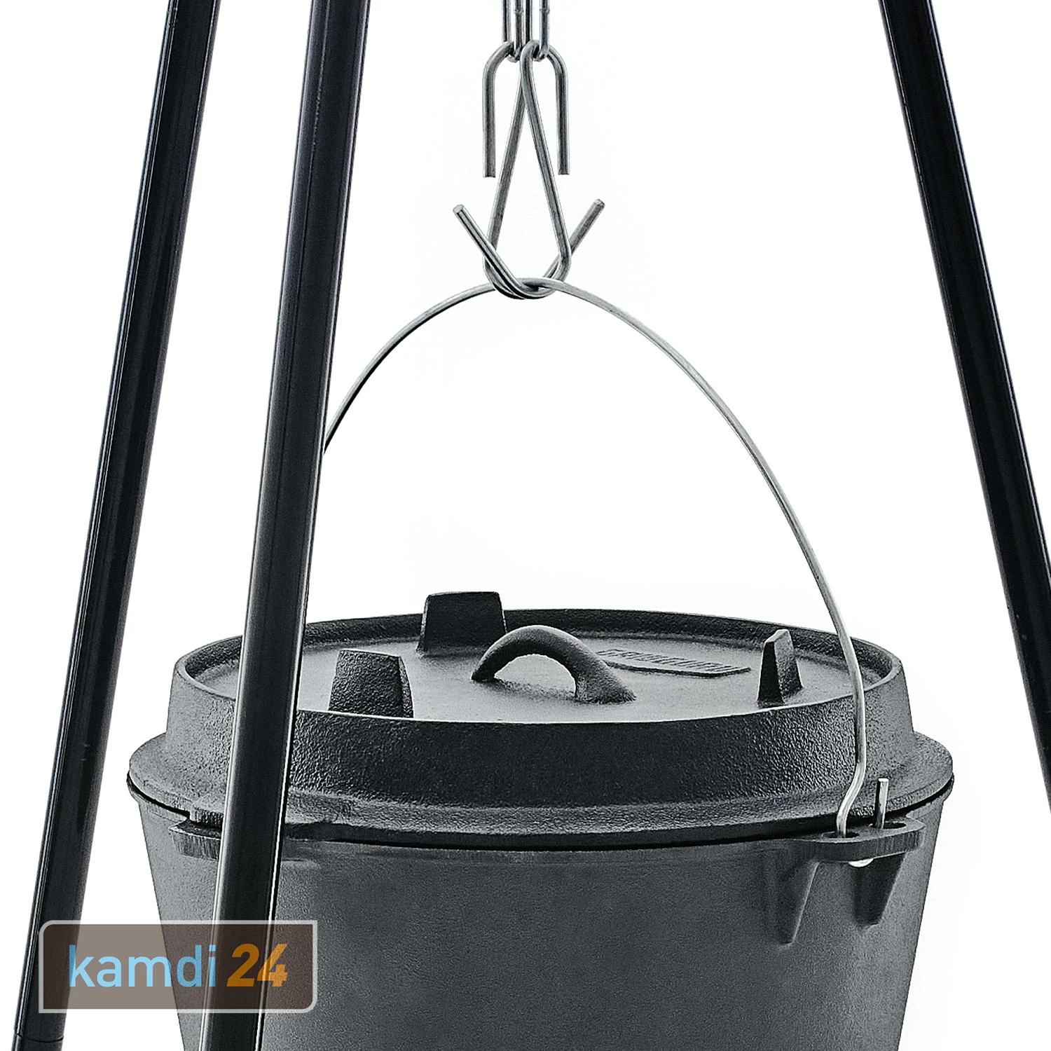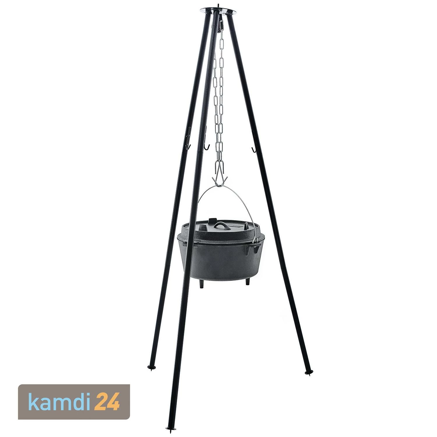 Stellen Sie das Dreibein über dem Lagerfeuer auf und hängen Sie den Dutch Oven an der Kette über dem Feuer auf – und schon kann das Kochen beginnen.