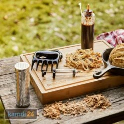 Der Kamado von Grill Guru ist mit hochwertigen Seitentischen aus Bambus-Holz ausgestattet. Diese bieten die Möglichkeit Grillzubehör wie , oder bequem abzustellen. Werden die Seitentische nicht benötigt, können diese ganz einfach zugeklappt werden.