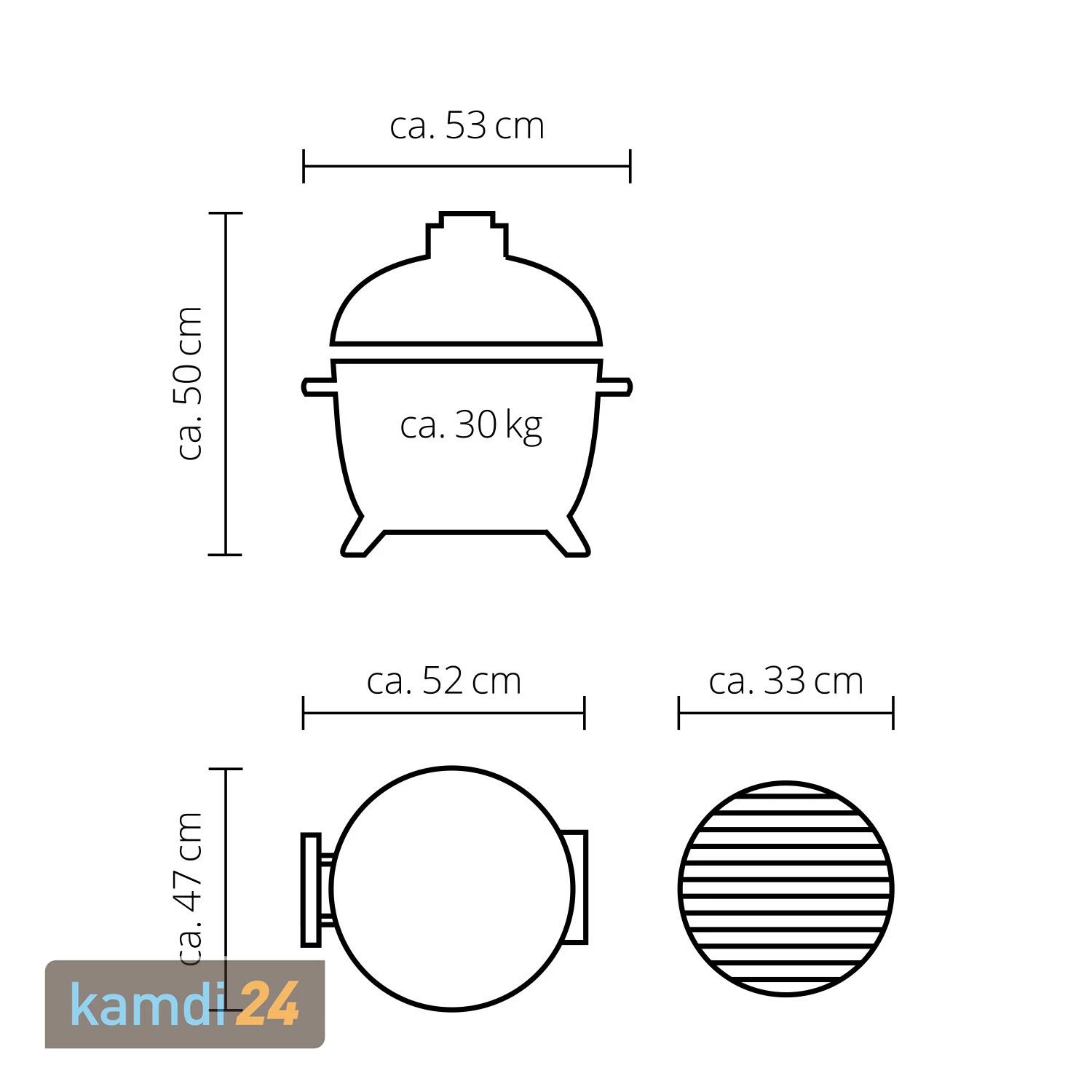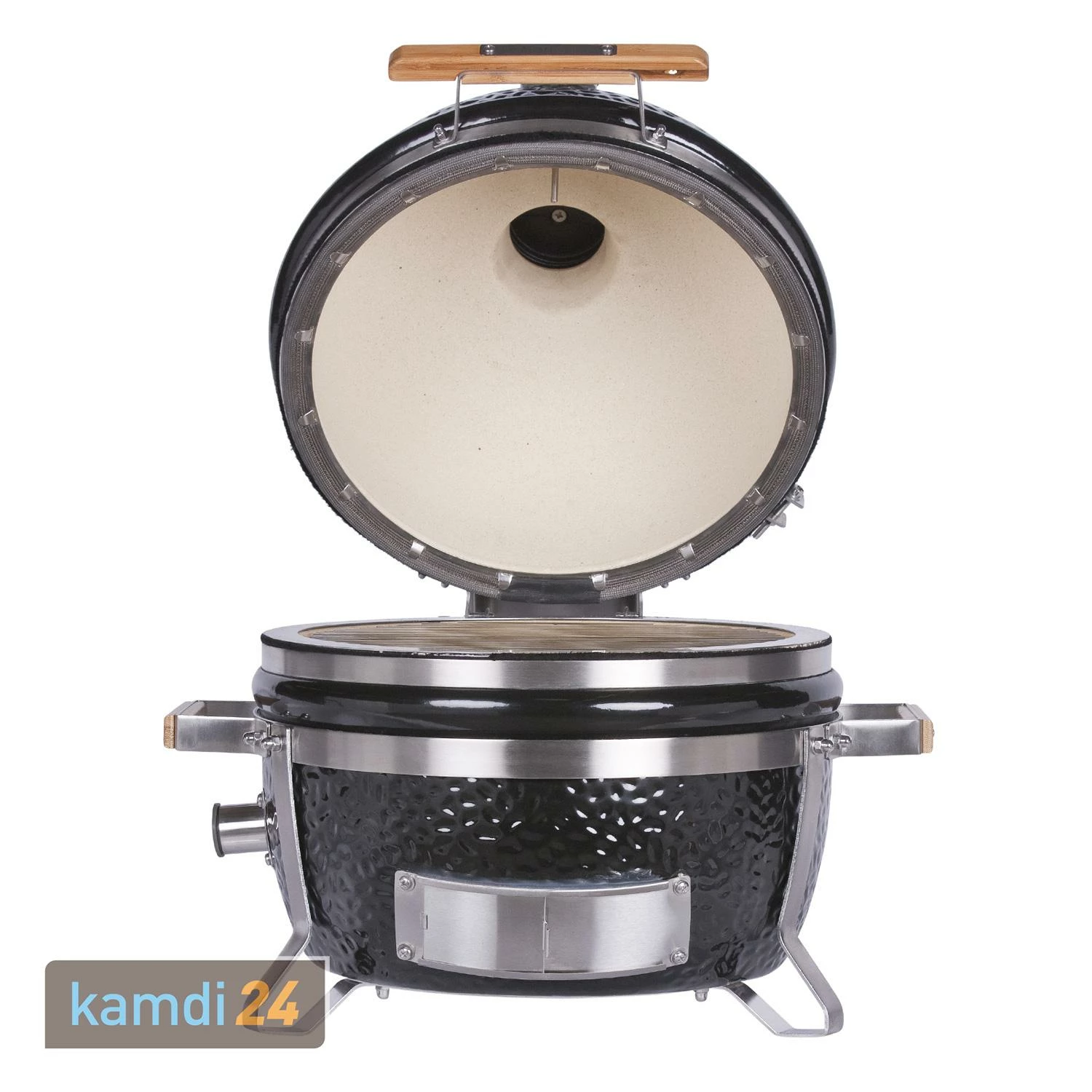 Der ist ein kleiner Allrounder. Er ist ein von nach dem Kamado-Prinzip und wird mit Holzkohle befeuert. Auf dem Grillrost haben bequem vier Steaks Platz. Mit dem Pizzastein, den Sie zusätzlich erwerben können, ist auch eine Pizza in wenigen Minuten fertig.