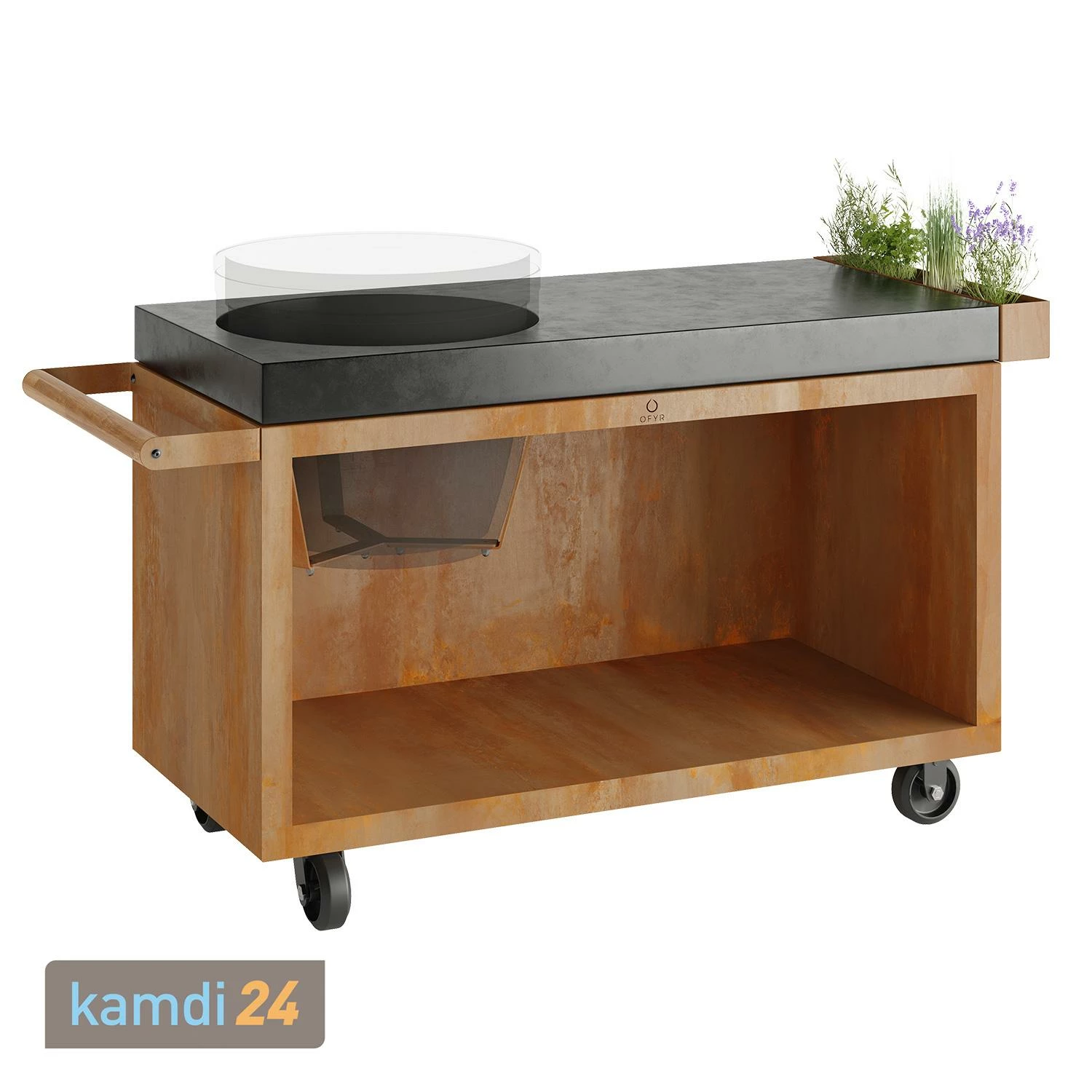 Die Basis der Cortenstahl-Variante besteht aus . Durch einen chemischen Prozess bildet sich auf der Oberfläche des Cortenstahls eine Schutzschicht, die im Vergleich zu anderen Stahlsorten eine gegen atmosphärische Korrosion aufweist. Dieseschützt vor Oxidationslöchern. Die zweite Variante des Kamado-Tisches hat eine Basis aus schwarz beschichtetem Stahl, der eine matte Oberfläche besitzt und hitzebeständig ist. Dank eines speziellen Beschichtungsprozesses ist auch der schwarze Sockel .