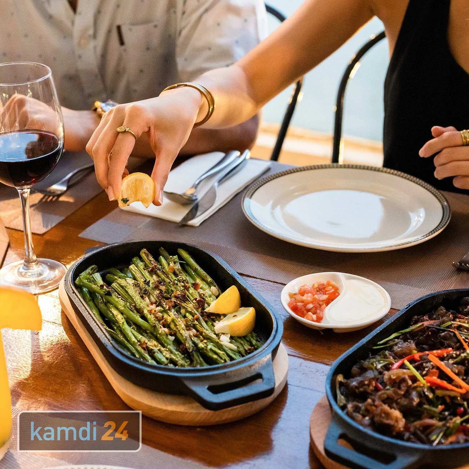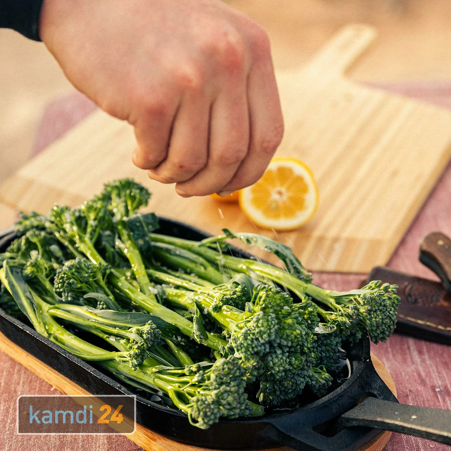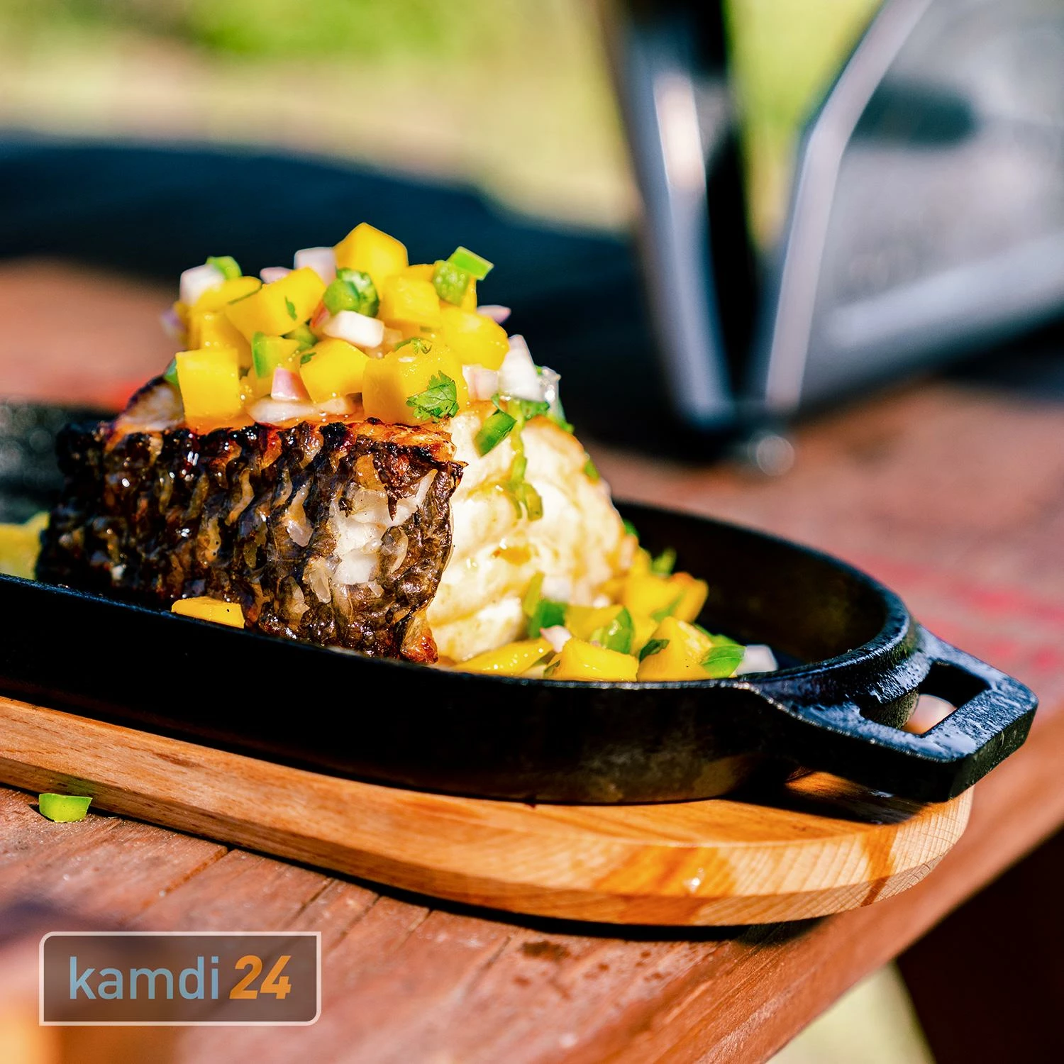Mit der von aus unserem können Sie empfindliche Lebensmittel wie Fisch, Meeresfrüchte und Gemüse in Ihrem Ooni Pizzaofen braten. Auch kleine Fleischstücke lassen sich darin zubereiten. Besonders praktisch ist der . Mit diesem können Sie die im Ofen platzieren und ohne Angst vor Verbrennungen wieder entnehmen. Zum Abstellen und Servieren der Pfanne dient der Untersetzter aus Holz.