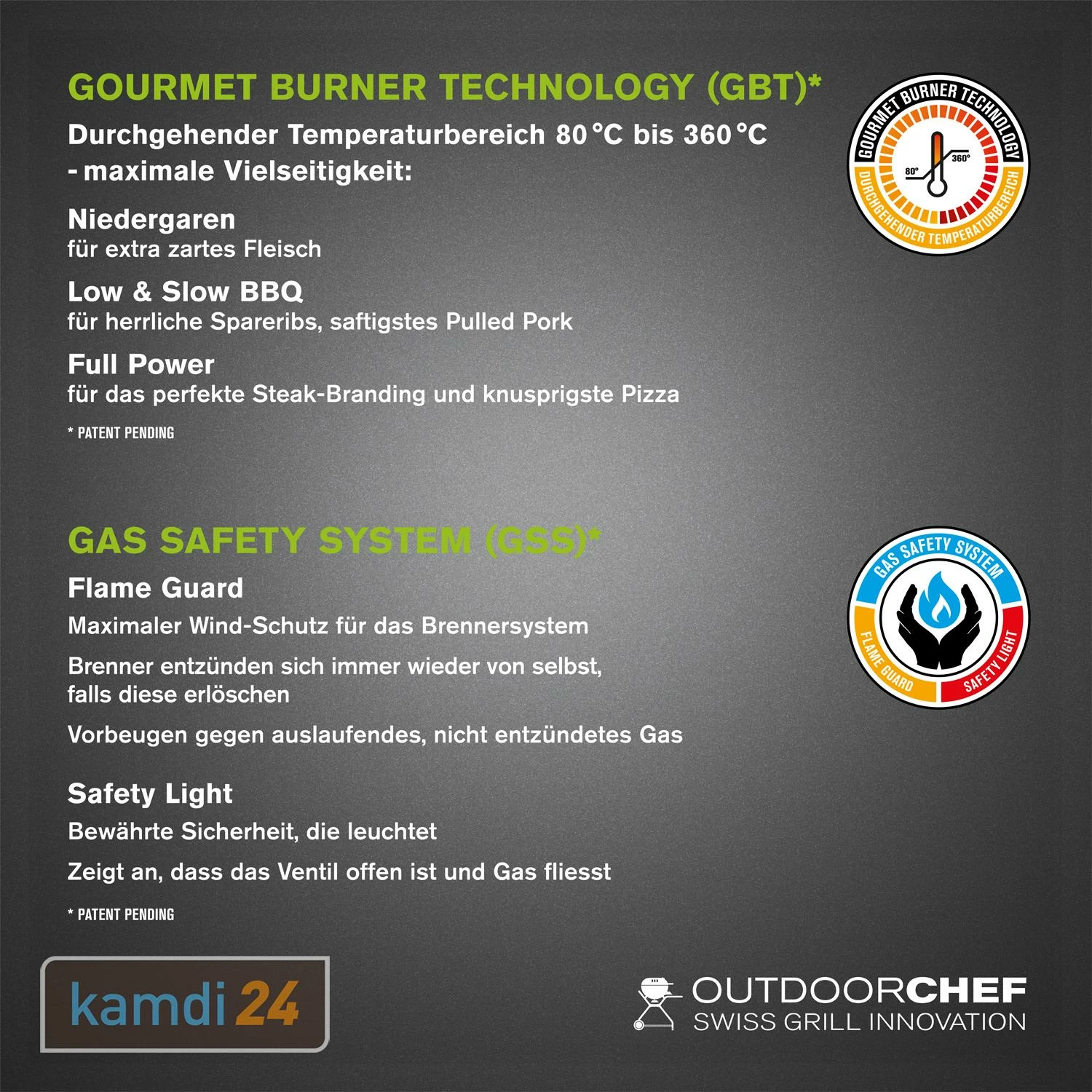Nicht nur eine gut durchdachte Technologie beim Grillen, sondern auch ein innovatives Sicherheitssystem zeichnen den aus. Der spezielle, von Outdoorchef entwickelte, schützt die eingeschalteten Brenner optimal vor den Wetterbedingungen. Selbst bei kühler Witterung und Wind können Sie Gerichte mit der Niedrigtemperaturmethode zubereiten. Der sorgt auch für ein selbstständiges Entzünden der Brenner, sollten diese durch einen Windstoß erloschen sein. Dadurch wird vermieden, dass Gas ausläuft und sich später ungewollt entzündetet. Die Safety Lights in allen Drehreglern zeigen an, ob ein Gasventil geöffnet ist. Sobald ein Brenner in Betrieb ist, leuchtet die entsprechende LED rot. Somit laufen Sie nicht Gefahr, aus Versehen einen Brenner angeschaltet zu lassen.