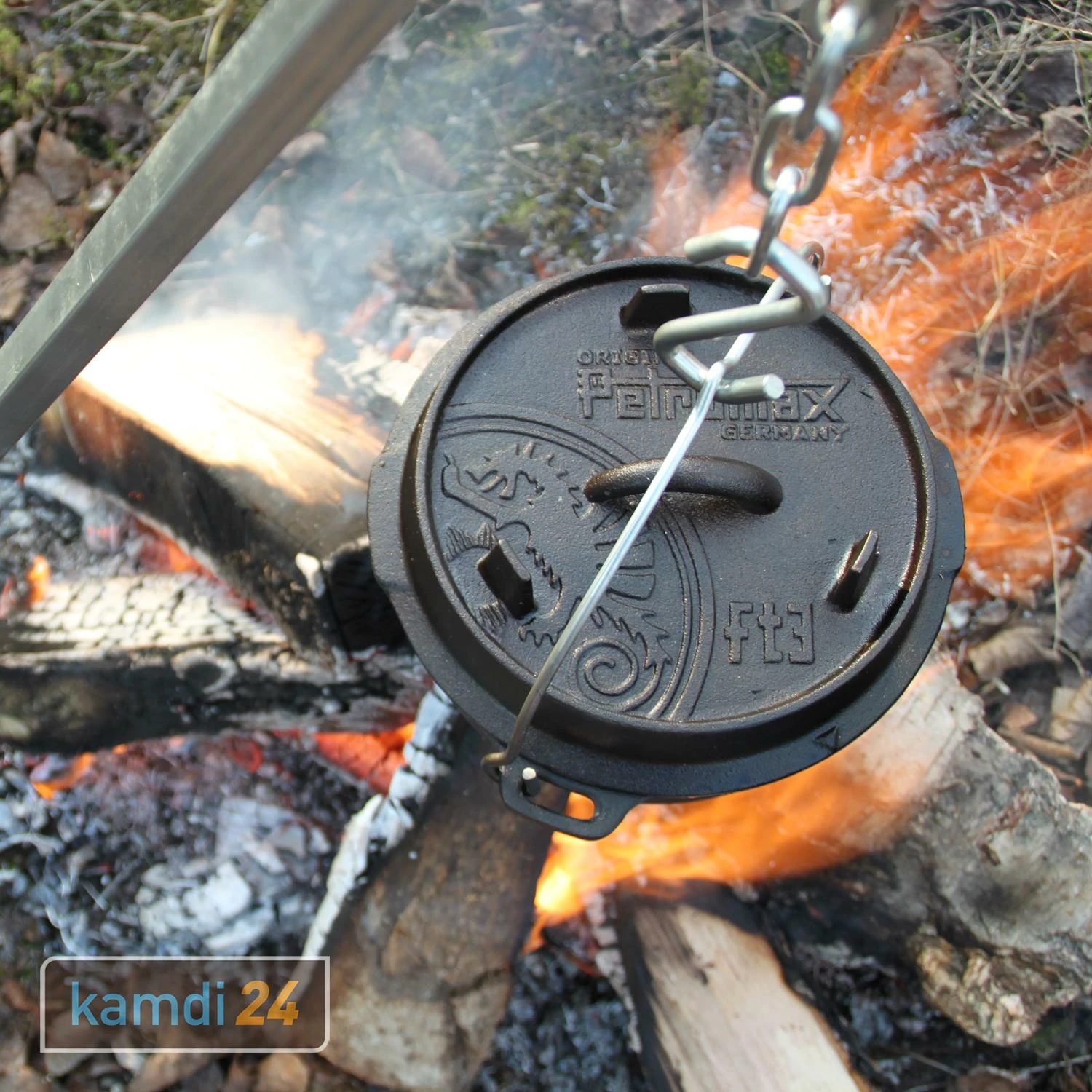 verfügt über einen stabilen Henkel, an welchem Sie den Feuertopf wie einen Kessel über dem Lagerfeuer aufhängen können. Damit er dabei nicht verrutscht, ist der Henkel mit einer Einkerbung versehen.
