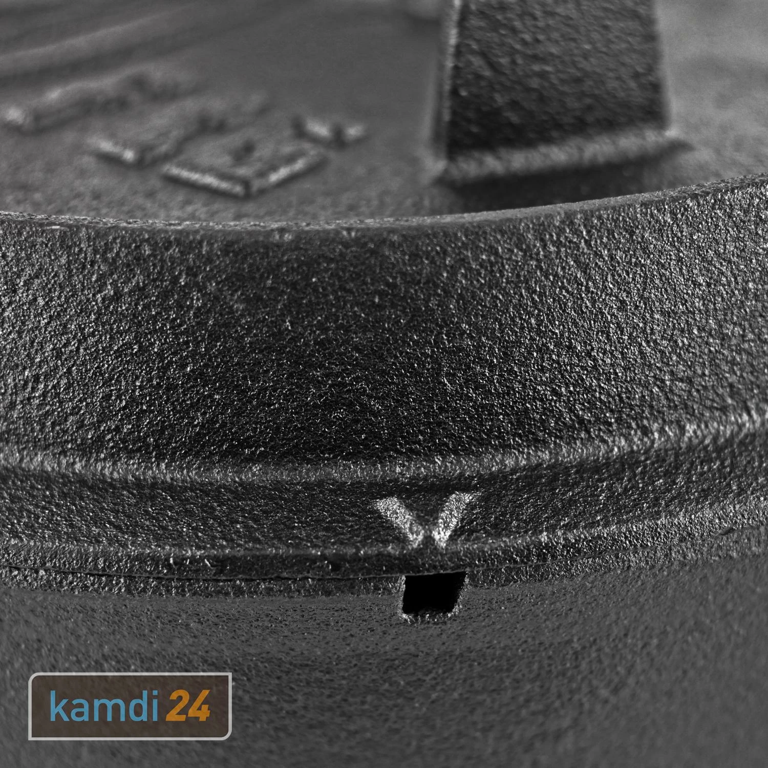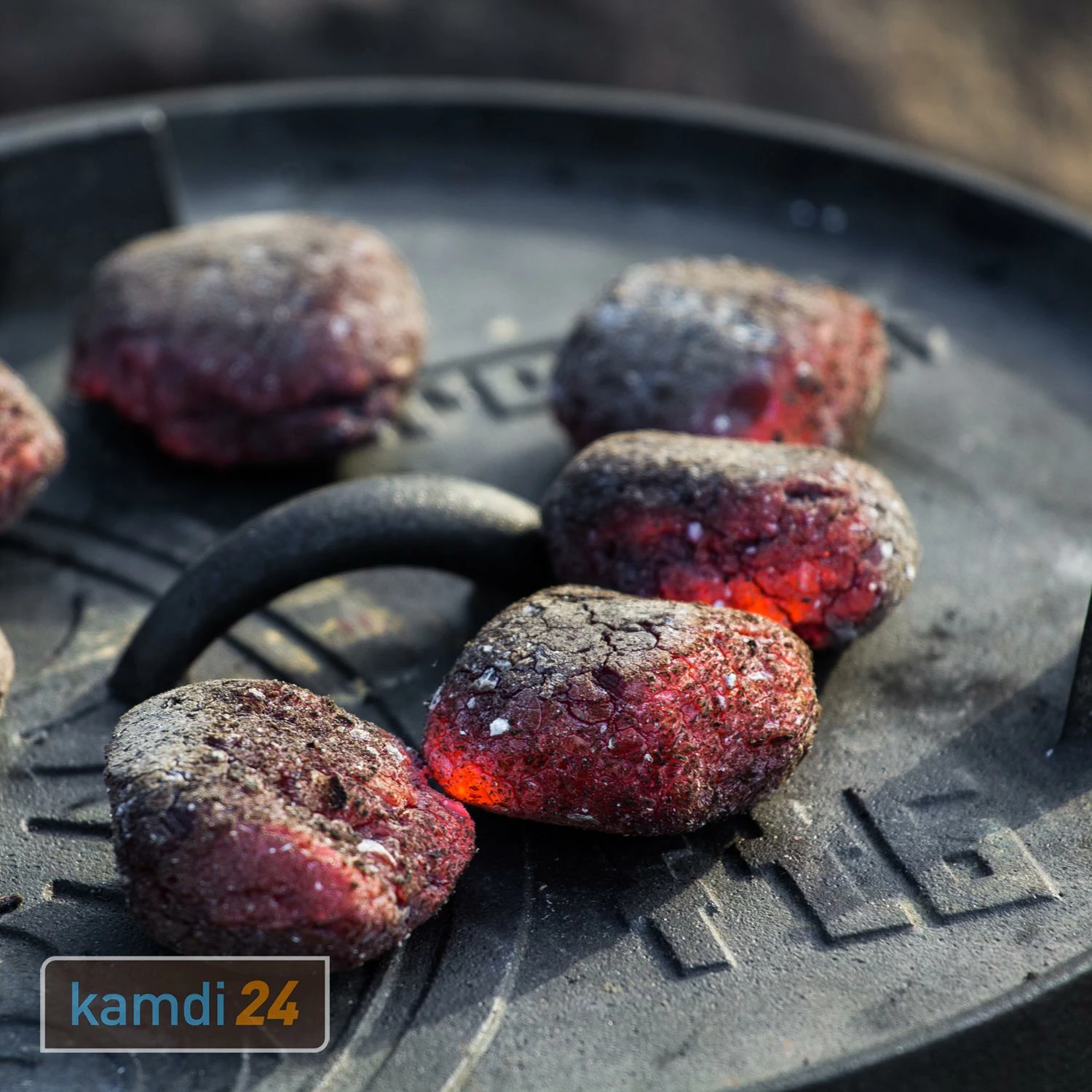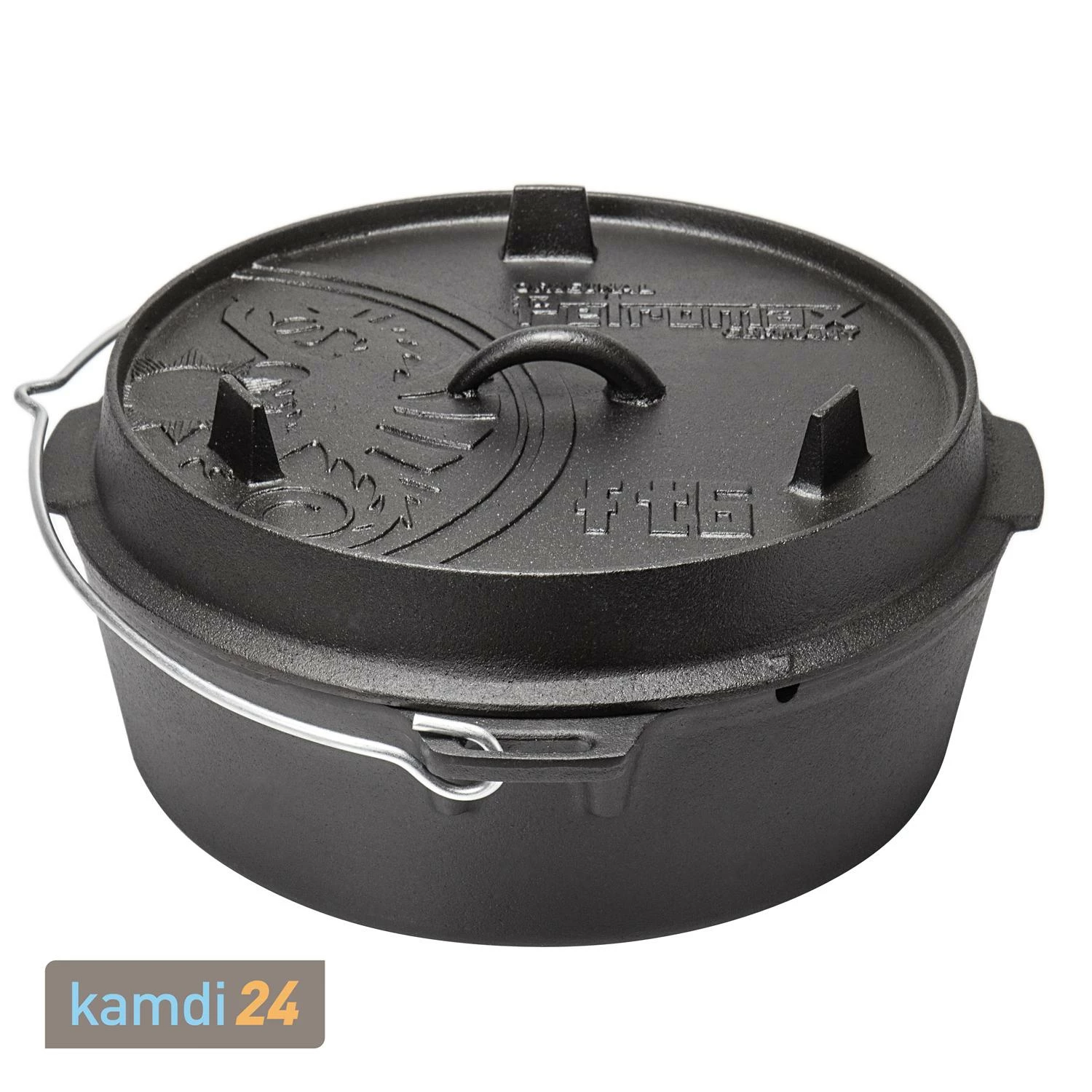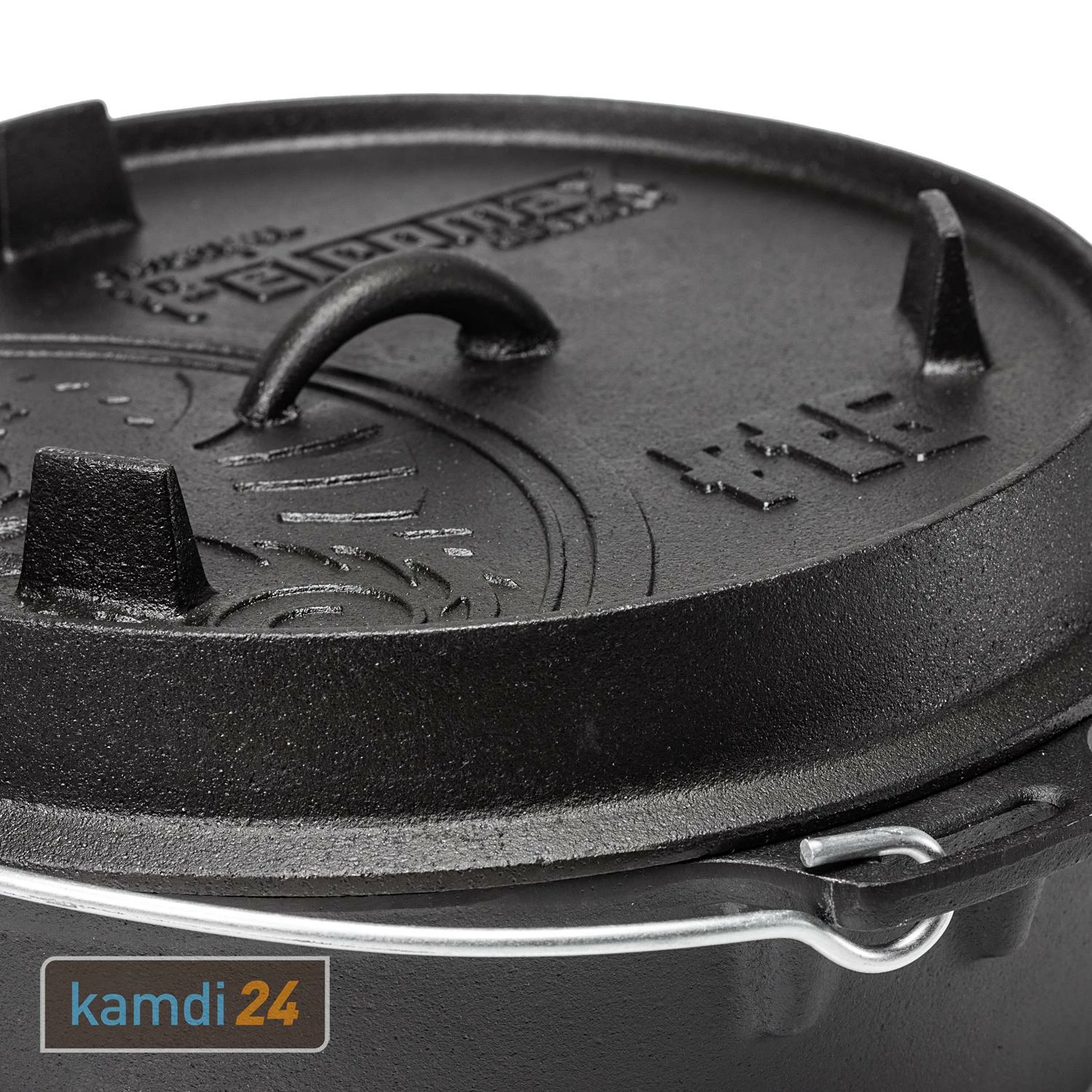 Auf dem Deckel von befinden sich drei gusseiserne Füße, die einerseits das Stapeln der Feuertöpfe ermöglichen und andererseits den Deckel zur Grill- und Servierplatte machen.