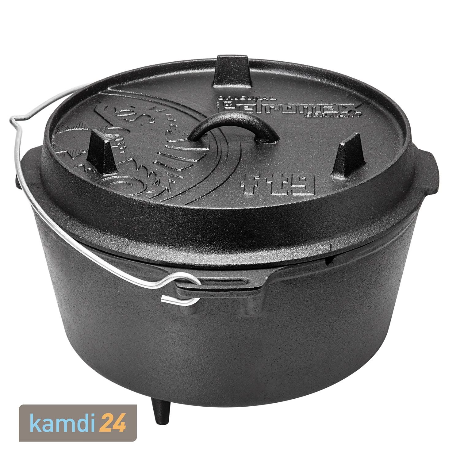 Ein eignet sich nicht nur zur Zubereitung von Suppen oder Eintöpfen – Sie können darin nahezu alle denkbaren Gerichte kochen, braten, backen oder grillen. Der dicht schließende Deckel ermöglicht einen Backofen- und Schnellkochtopf-Effekt, wenn Sie darauf glühende Kohlen platzieren. Die gleichmäßige Wärmeverteilung in den massiven Gusseisen-Wänden sorgt für kurze Garzeiten.