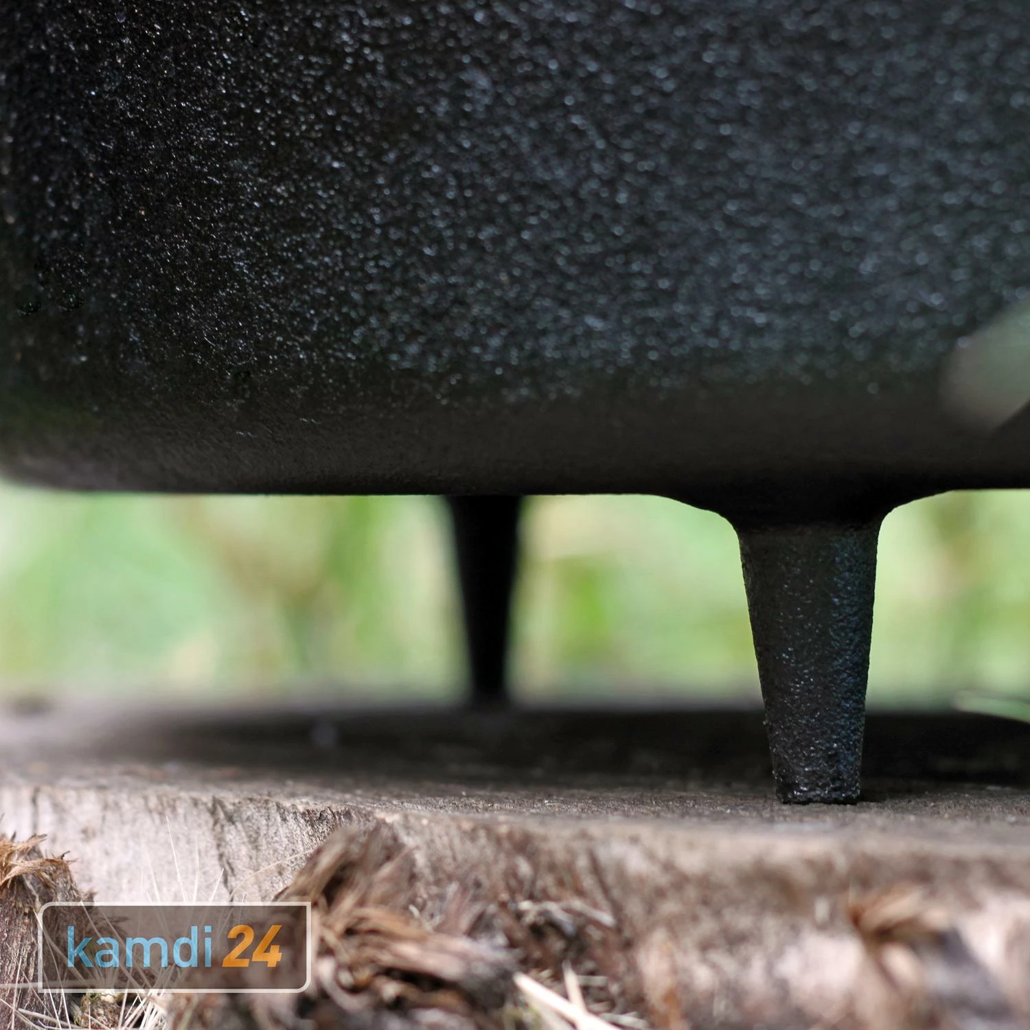 Verwenden Sie den bei Ausflügen oder im Garten entweder auf oder über dem Lagerfeuer. Wenn Sie glühende Kohlen sowohl unter dem Topf als auch auf dem Deckel platzieren, erreichen Sie eine intensive Rundumwärme, die Fleisch besonders saftig und zart werden lässt, aber auch Eintöpfe und Schmorgerichte auf einzigartige Weise gart.