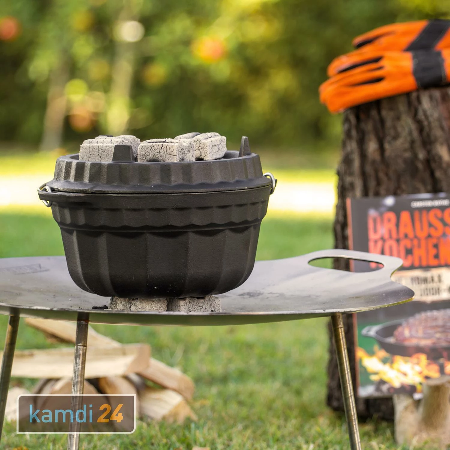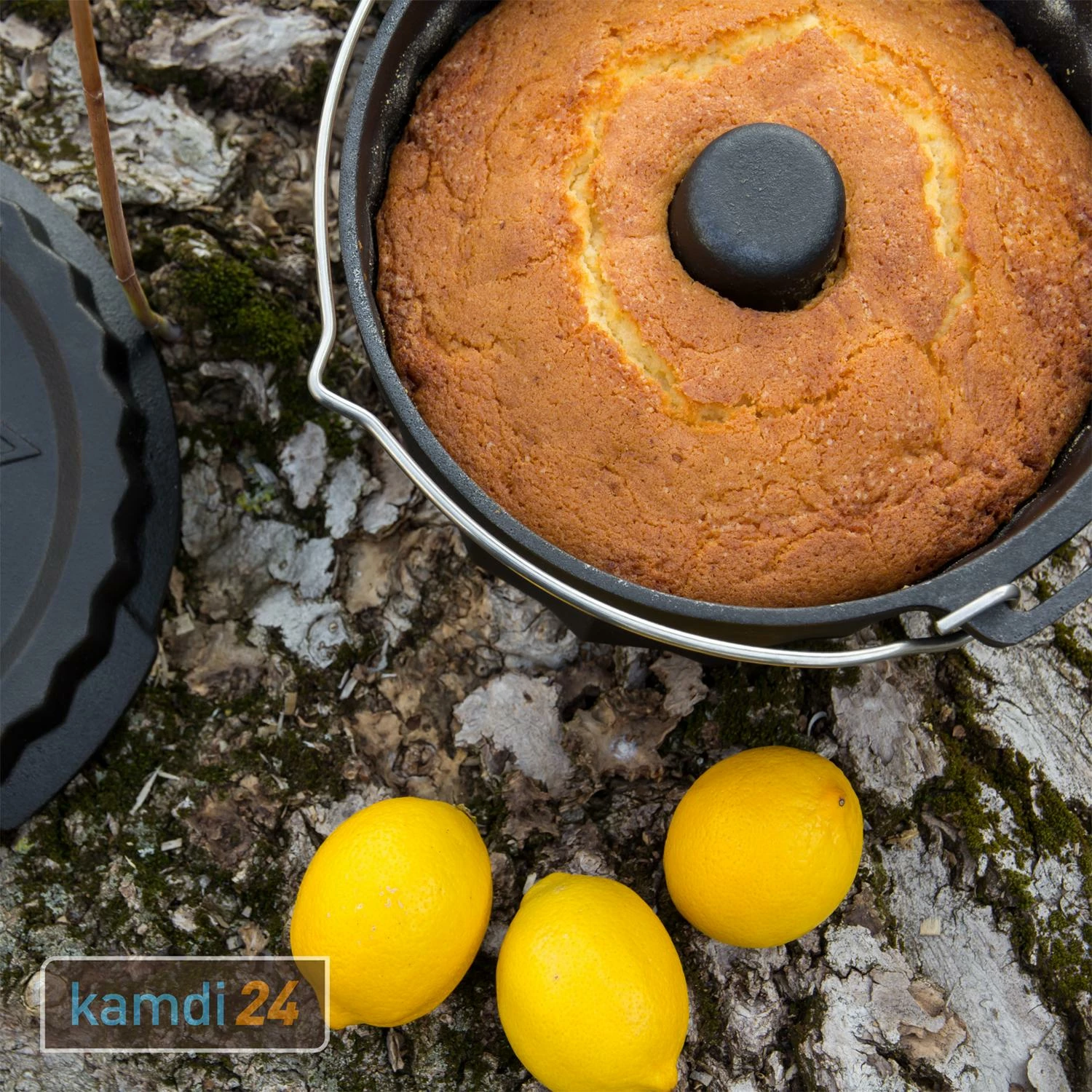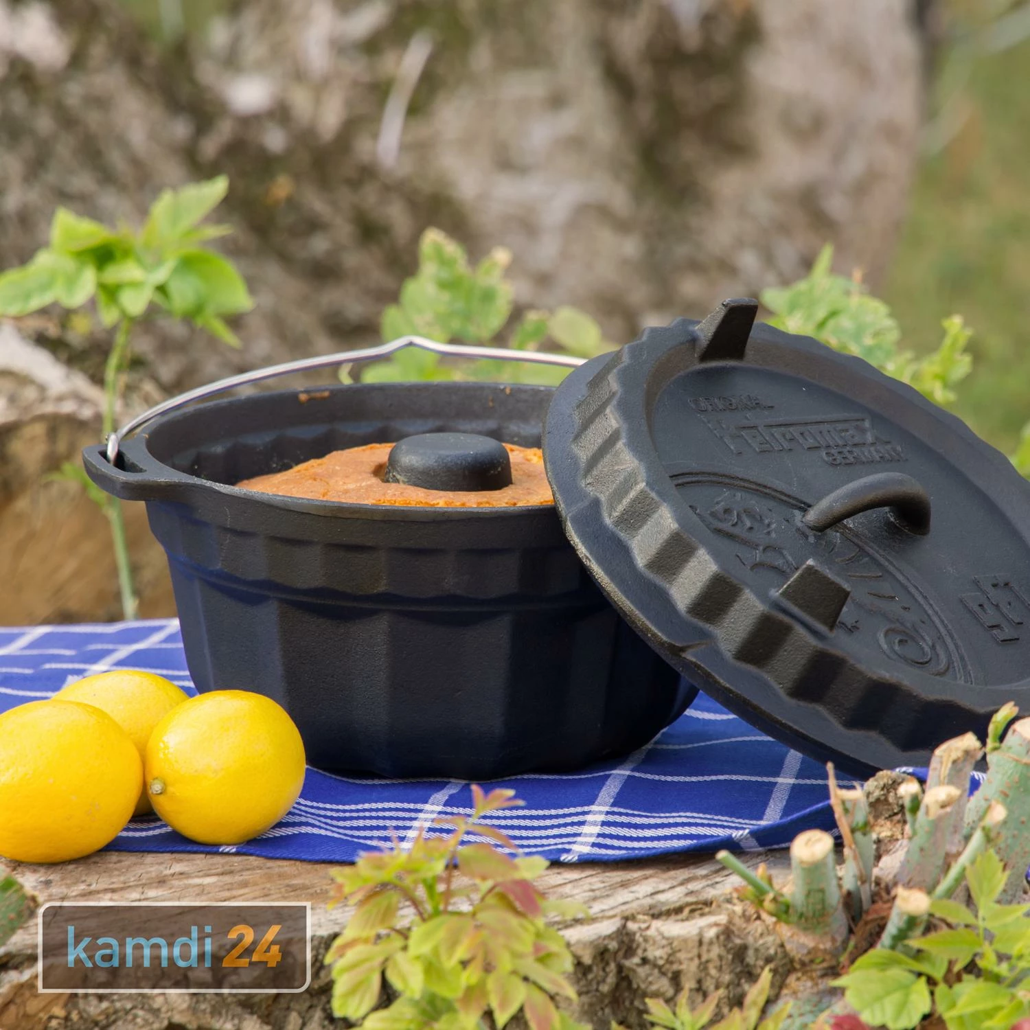 Die von sorgt für Backspaß am Lagerfeuer. In der können Sie leckere Kuchen, aber auch saftige Aufläufe oder Brot in Kranzform backen. Die exzellente Wärmeleitfähigkeit des Gusseisens sorgt für ein gleichmäßiges Backergebnis über dem Feuer oder auf glühenden Kohlen. Wenn Sie auch auf dem Deckel platzieren, erreichen Sie einen Rundumwärme-Effekt wie in einem Umluft-Backofen. Darüber hinaus lässt sich die Gugelhupfform natürlich auch zu Hause im Ofen wie eine normale Kuchenform verwenden.