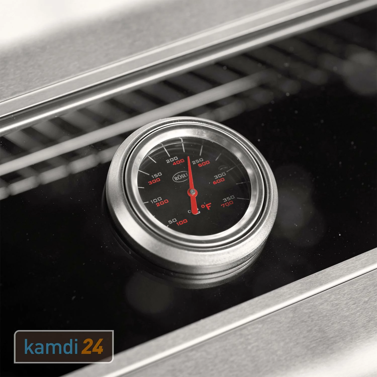 Dank der geschickten Konstruktion des Deckels mit Sichtfenster haben Sie das Grillgut immer im Blick, ohne den Deckel zu öffnen und damit einen Hitzeverlust im Garraum zu bewirken. Ein gut ablesbares Thermometer zeigt die Grilltemperatur in °C und °F an.
