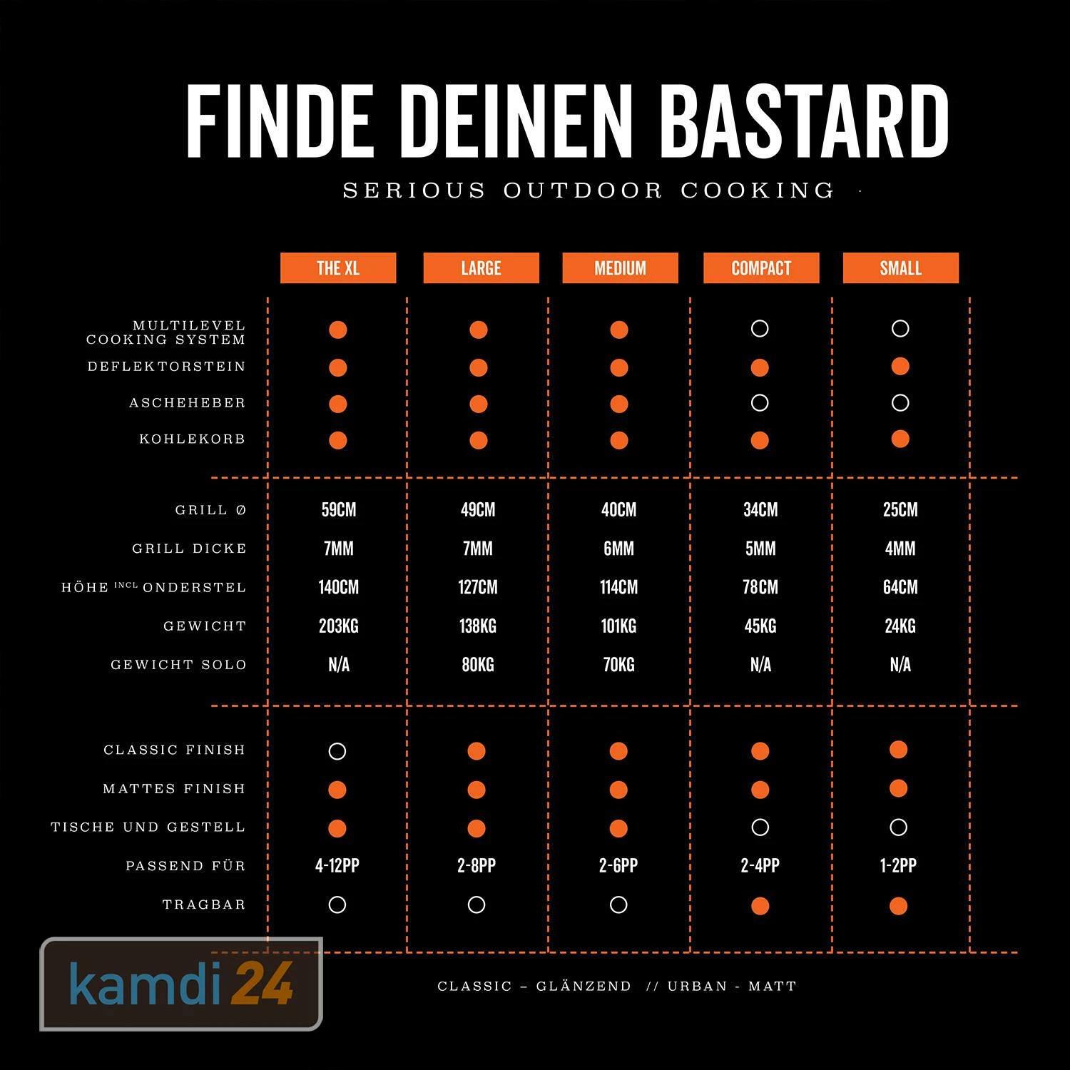 Mit seinem matten Finish hinterlässt der des gleichnamigen Herstellers einen besonders stylishen Eindruck. Doch neben den Äußerlichkeiten, punktet der Kamado auch mit einem durchdachten Innenleben: Der halbmondförmige und zweigeteilte Wärmedeflektor ermöglicht das direkte als auch indirekte Grillen. Dreht man das Deflektorgestell um, kann dieses sogar mit verschiedenem Zubehör, wie beispielsweise einem Wok, genutzt werden. Zur Ausstattung gehört zudem ein sowie ein ebenfalls geteilter und eine praktische . Die Infinity-Dichtung hält die Wärme optimal im Grill, was Sie über das integrierte Deckelthermometer stets kontrollieren können. Über das Präzisionsrad auf der Kuppel stellen Sie die richtige Luftzufuhr ein. Der Bastard Large Urban Solo eignet sich perfekt zum Verköstigen von .