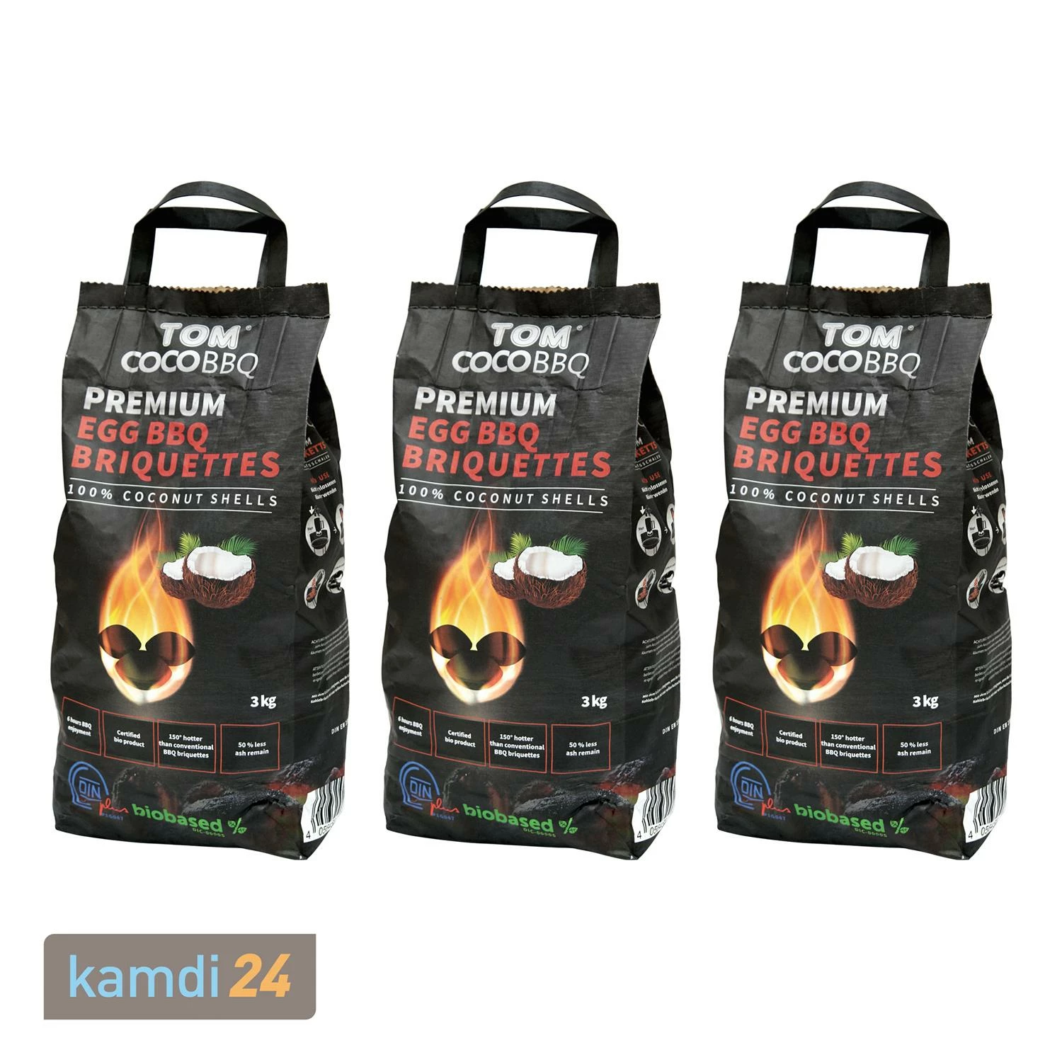 TOM COCO Grill-Kokoskohle Briketts, Eiform, 3 X 3 Kg (9 Kg)