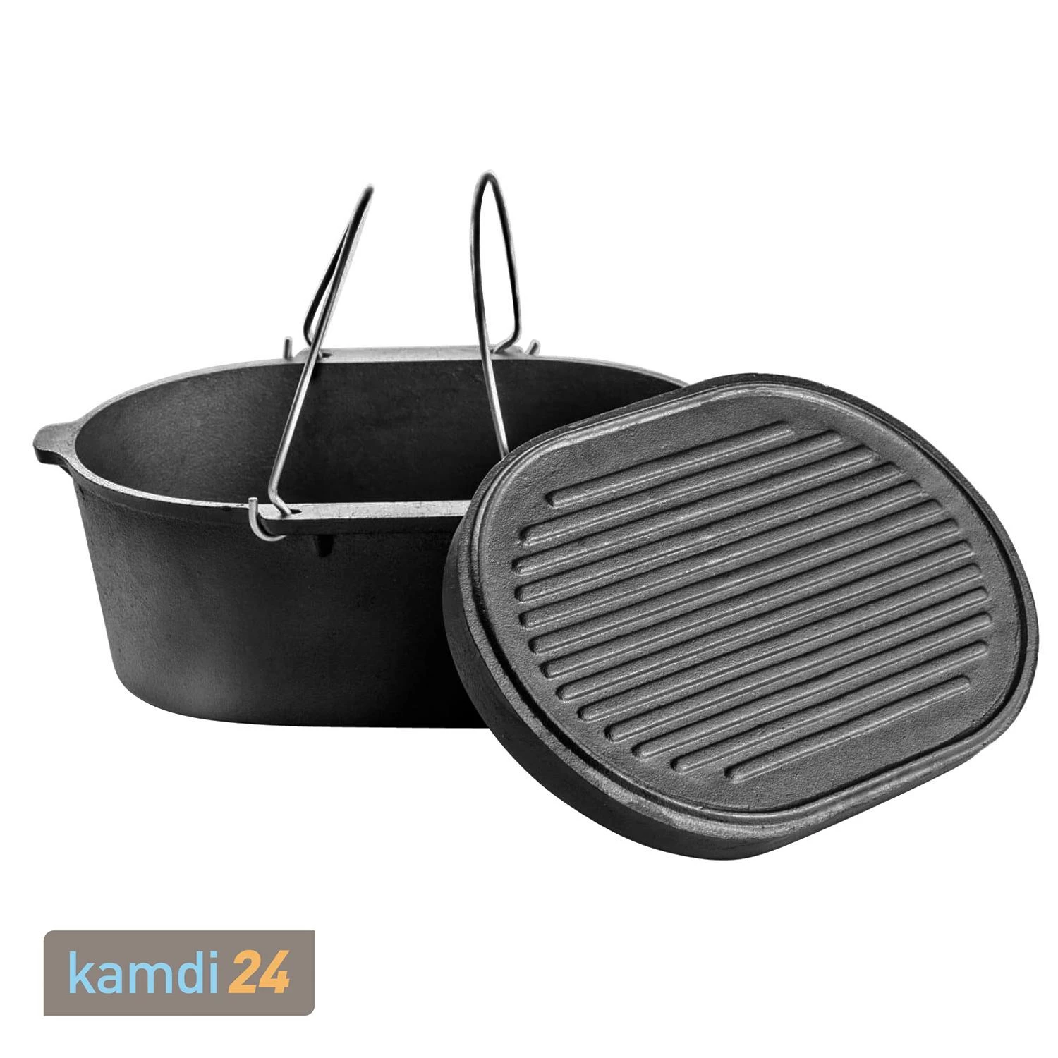 Der eignet sich nicht nur zur Zubereitung von Suppen oder Eintöpfen – Sie können darin nahezu alle denkbaren Gerichte kochen, braten, backen oder grillen. Der dicht schließende Deckel ermöglicht einen Backofen- und Schnellkochtopf-Effekt, wenn Sie darauf glühende Kohlen platzieren. Die gleichmäßige Wärmeverteilung in den massiven Gusseisen-Wänden sorgt für kurze Garzeiten.