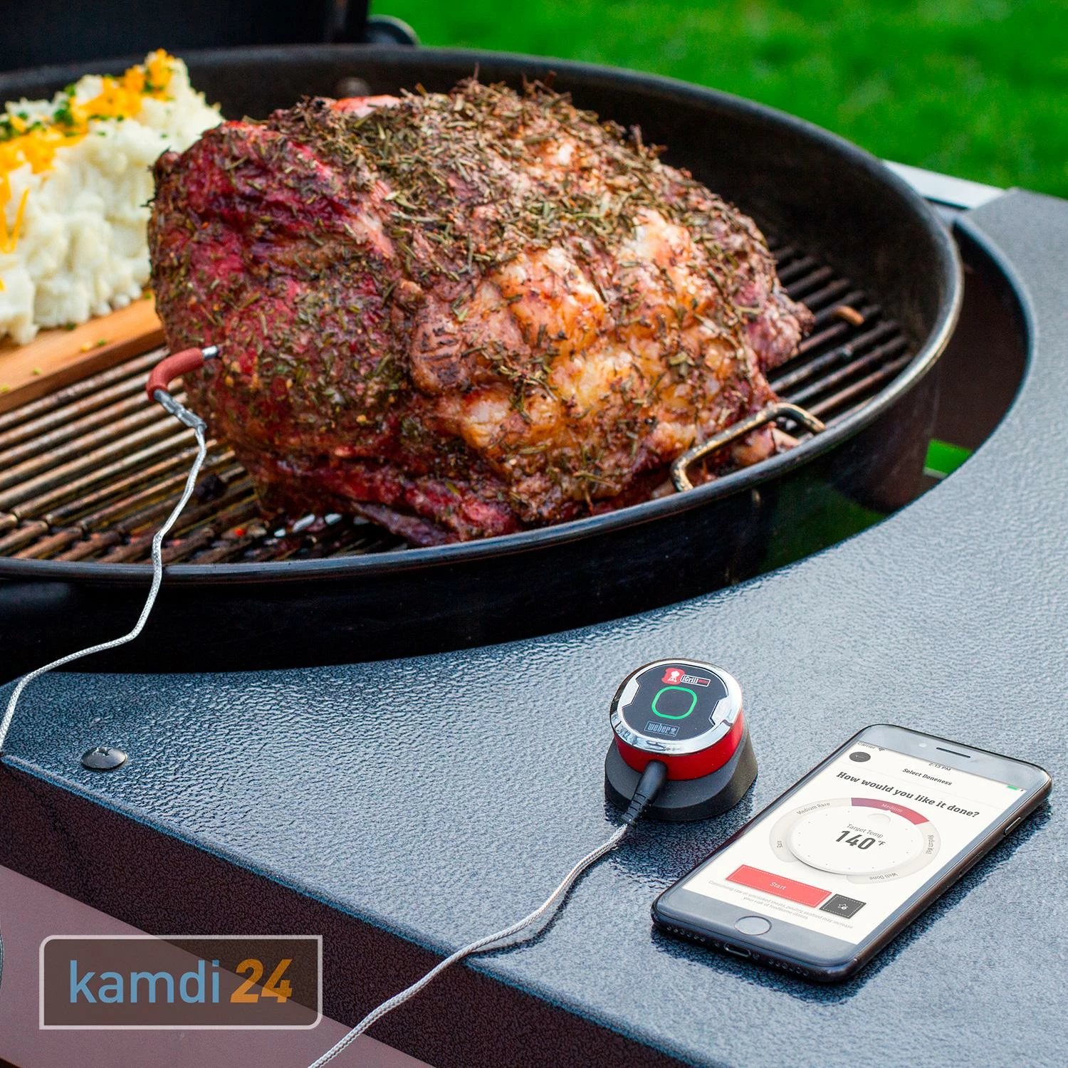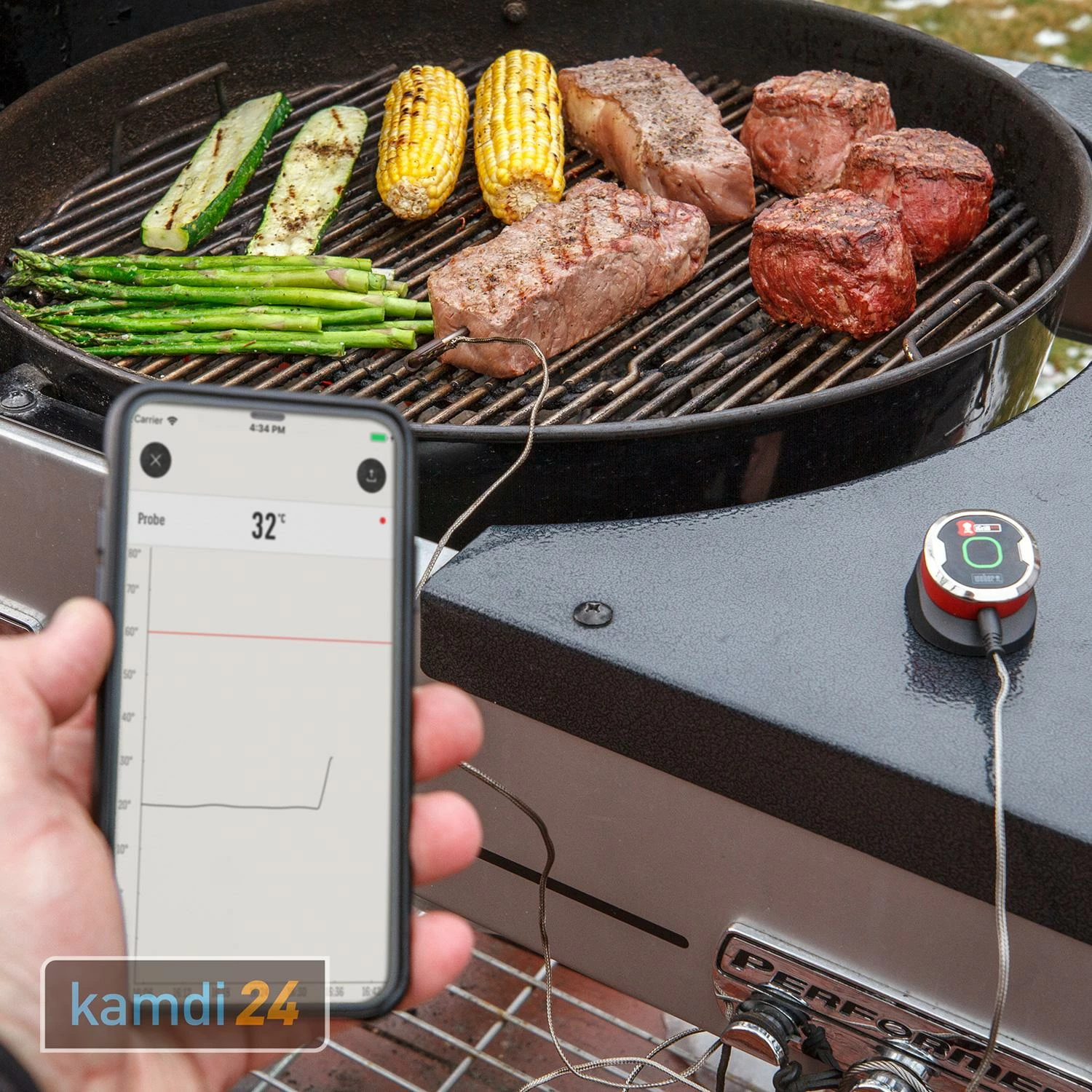 Über wird eine Verbindung zum Smartphone hergestellt. Mit der kostenlosen von Weber hast du die Werte genau im Blick. Anhand von wird der Grillfortschritt angezeigt: Grün – der Grill heizt vor, Gelb – 15 Grad von Zieltemperatur entfernt, Orange – 5 Grad von Zieltemperatur entfernt, Rot – das Grillgut ist fertig